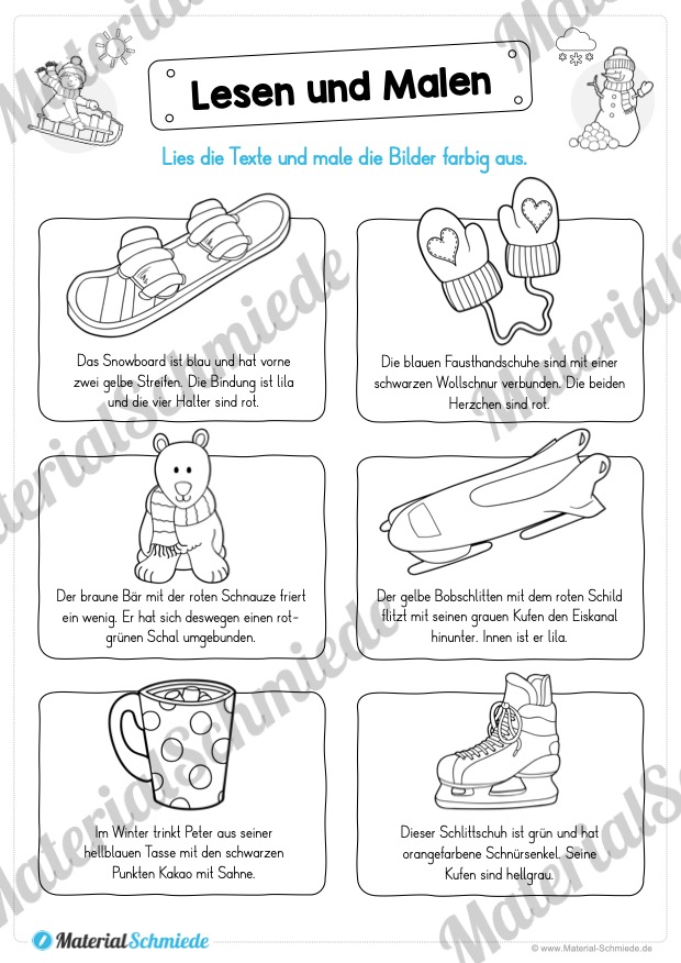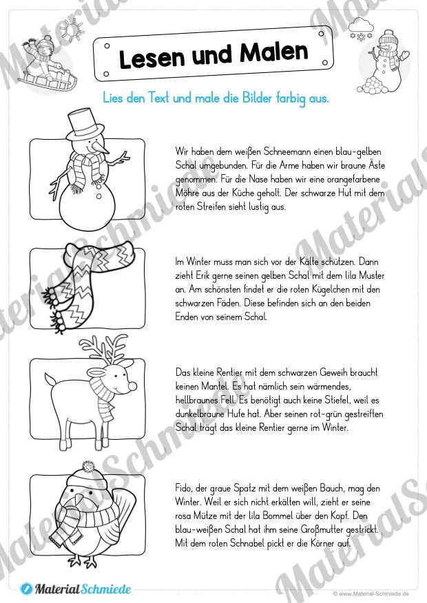 Dieses Materialpaket enthält insgesamt 15 verschiedene Arbeitsblätter zum Thema Lesen und Malen im Winter.