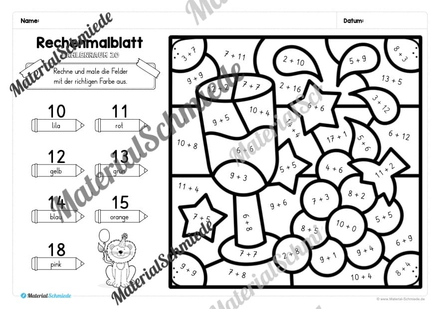 Die Aufgabe für die Schüler besteht darin, die Aufgaben im Zahlenraum bis 20 auf dem Bild zu lösen. Je nach Ergebnis, soll eine andere (vorgegebene) Farbe ausgemalt werden. So lernen die Schüler spielerisch Rechnen.