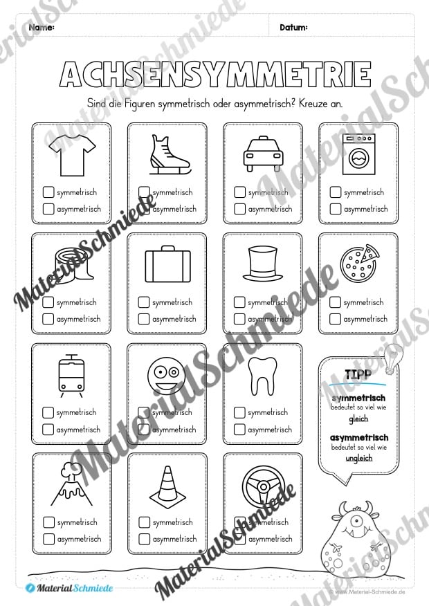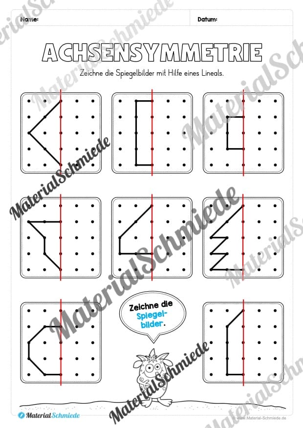 Mit Hilfe dieses Arbeitsheftes erhalten die Schüler einen leichten Einstieg in das Thema Achsensymmetrie. Begleitet werden die Aufgaben von kleinen Monstern, welche den Kindern Tipps geben und die Motivation bei der Bearbeitung der Aufgaben aufrecht erhalten.