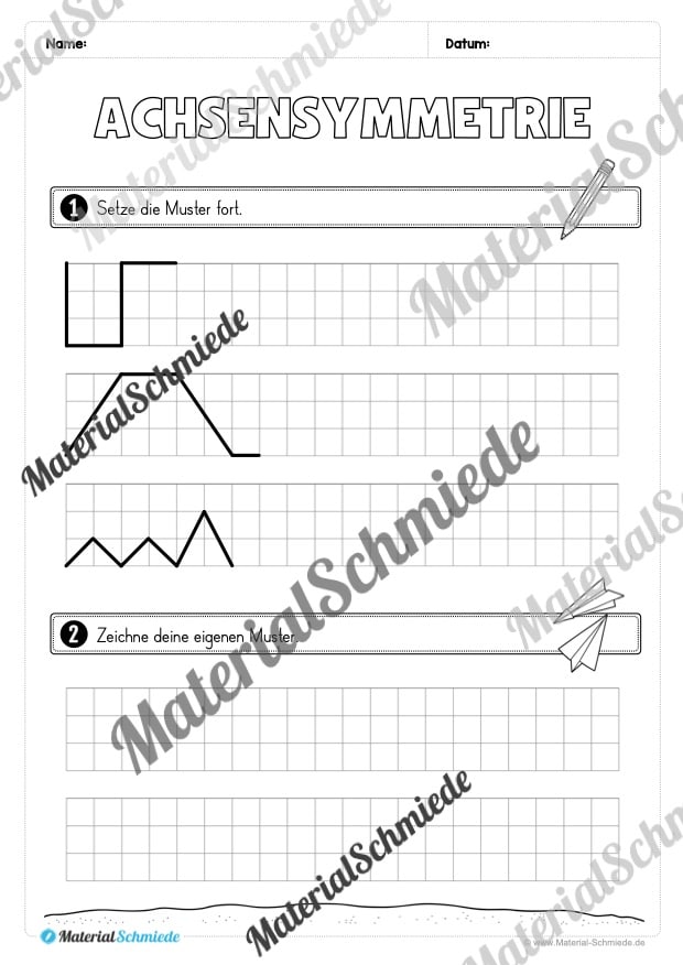 Anschließend folgen verschiedene Aufgaben rund um das Thema Symmetrie und Spiegelbilder. So sollen die Schüler Figuren zwischen symmetrisch und asymmetrisch unterscheiden, Spiegelachsen einzeichnen, Spiegelbilder zeichnen und Muster vervollständigen.