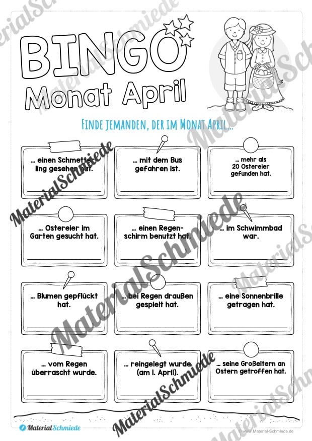Die Schüler sollen jeweils jemanden in der Schulklasse finden, der im Monat April etwas Bestimmtes erlebt hat. Ist jemand gefunden, so soll der Name notiert werden.
