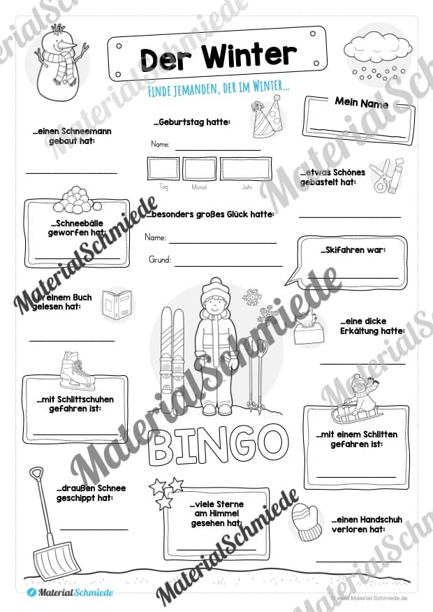 Auf diesem Arbeitsblatt findet ihr ein Bingo zum Thema Winter. Die Schüler sollen jemanden in der Schulklasse finden, der etwas Bestimmtes im Winter erlebt hat.
