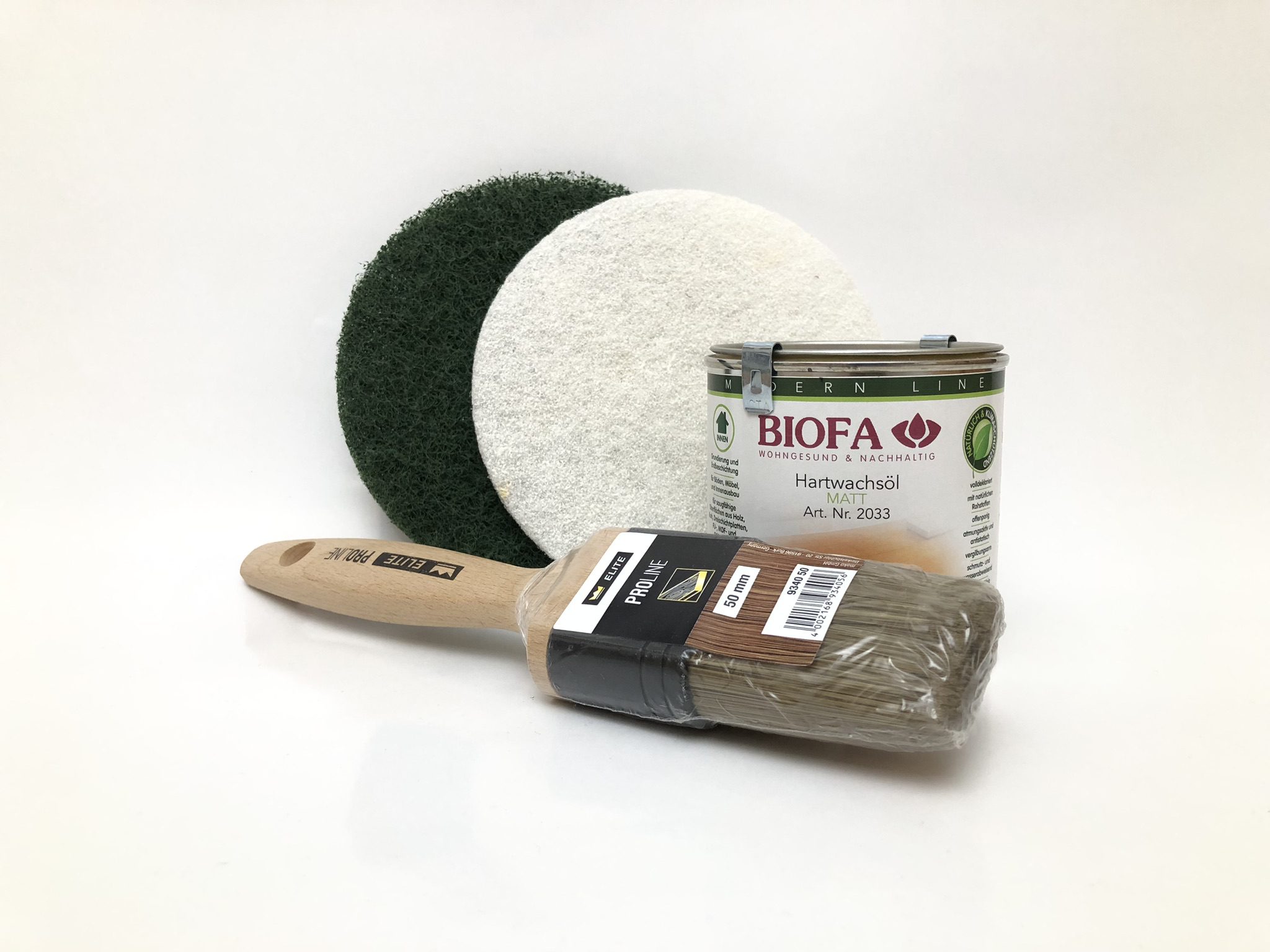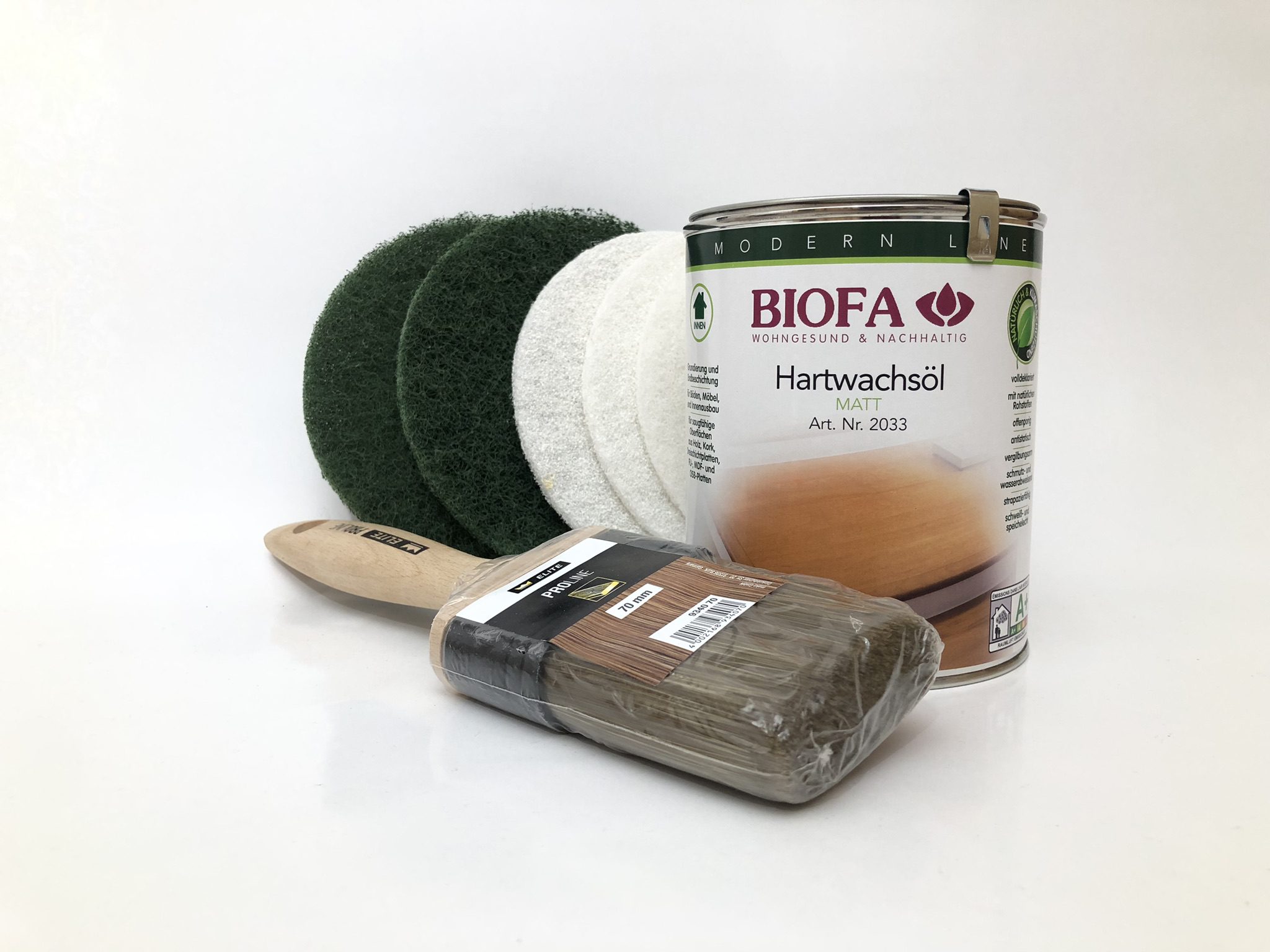 Als Endbehandlung für BIOFA Coloröle wird 1 Anstrich Hartwachsöl als Finish aufgebracht, wobei das Hartwachsöl mit bis zu max. 10% Coloröl, mit dem der Boden eingefärbt wurde, abgetönt wird. Bei extrem saugstarken Untergründen kann ein 2. Anstrich erforderlich sein.