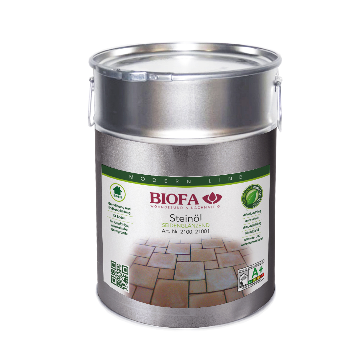 Das aus hochwertigen Naturölen und Harzen hergestellte Steinöl 2100 von BIOFA eignet sich je nach Untergrund als farblose Grundierung und Schlussbeschichtung für saugfähige mineralische Untergründe wie z. B. Estrich Boden, Cotto Fliesen, Terrazzo, etc. im Innenbereich.