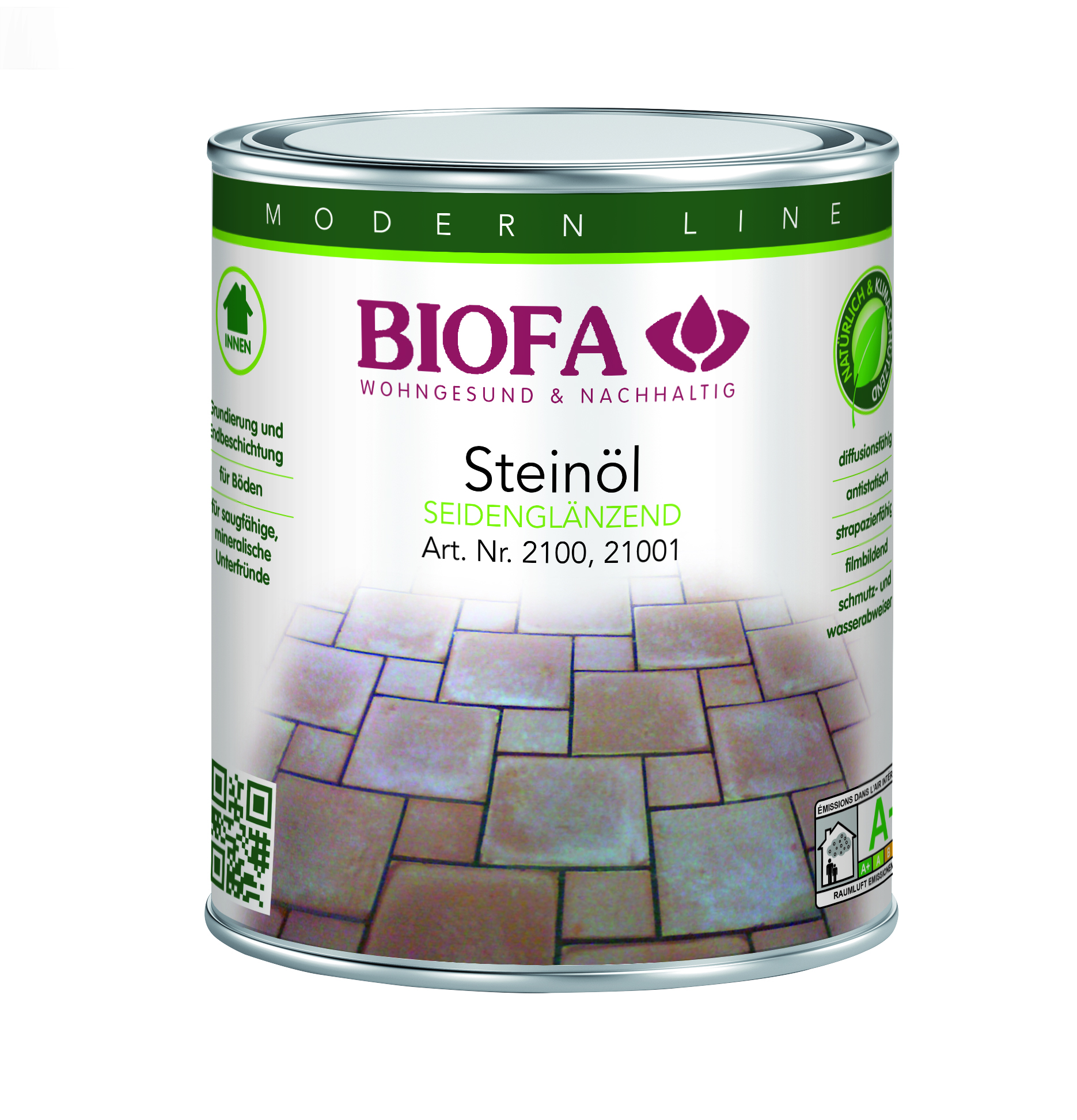 BIOFA Steinöl ist eine Verkochung hochwertiger Naturöle und Harze. Es ergibt seidenglänzende, strapazierfähige, wasserabweisende Oberflächen und eignet sich je nach Untergrund als farblose oder eingefärbte Grundierung und Schlussbeschichtung für saugfähige mineralische Untergründe im Innenbereich. Achtung! Oxydativ trocknende Öle können bei farblosen, weißen, blauen und hellen Abtönungen zu Vergilbungen führen. Die Vergilbung tritt besonders als Dunkelvergilbung bei dunklen Lichtverhältnissen sowie durch Abdeckung der Oberflächen durch Teppiche, Vorleger, etc. auf.