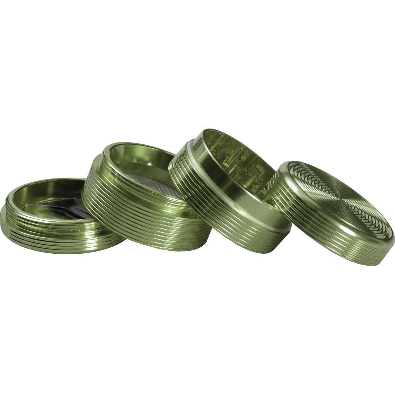 BL Groove-Grinder 4-tlg. – CNC-gefräster Alugrinder mit diamantförmigen scharf geschliffenen Zähnen und formschön gerillter Außenseite. Aufbau: Bodenkammer, Pollensieb, Mahlwerk, Deckel mit Magnetverschluss.