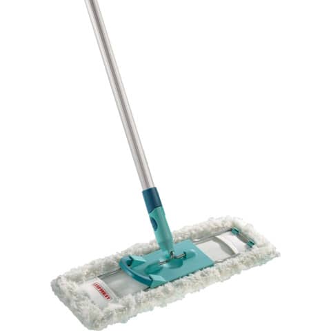 Leifheit Bodenwischer Profi Micro Duo. Schluss mit Rückenschmerzen beim Putzen und unschönen Schlieren. Der Leifheit Profi XL micro duo entfernt mit seinem speziellen 2-Faser-Wischbezug auch hartnäckigen Schmutz und lässt sich ganz bequem per Fuß bedienen. So sieht der ideale Bodenwischer für große Flächen, wie Küchen oder auch Büroräume, aus. Der 2-Faser-Wischbezug besteht aus der bewährten Leifheit Microfaser Duo. Reihen von feinsten, leicht erhöhten Borsten reichen bis in kleinste Vertiefungen hinein und entfernen auch hartnäckigen Schmutz ohne Kraftanstrengung. Mit seiner stattlichen Wischbreite von 42 cm spart der Profi micro duo viele Arbeitsschritte und wertvolle Zeit. Das geniale, rundum bewegliche 360°-Drehgelenk ermöglicht ein effektives Reinigen in Schlangenlinien und umkreist geschickt Tisch- und Schrankbeine. Durch den komplett abwinkelbaren Stiel sind auch schwer zugängliche Stellen unter Schränken und Betten leicht zu erreichen. Bedienen lässt sich der Bodenwischer ganz bequem im Stehen: Einfach per Fußklick den Wischüberzug lösen, in der separat erhältlichen Leifheit Wischtuchpresse Profi XL auspressen, Bezug wieder einspannen, fertig.