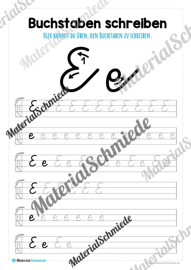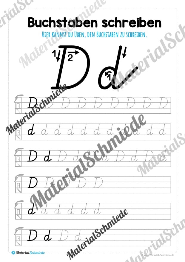 Die Kinder finden zu jedem Buchstaben im Alphabet ein Arbeitsblatt vor. Darauf wird zunächst aufgezeigt, wie der Groß- und Kleinbuchstabe geschrieben wird. Im Anschluss sollen die Kinder je Reihe den Buchstaben nachspuren und diesen somit schreiben lernen. Zunächst folgt der Großbuchstabe, anschließend in der nächsten Zeile der Kleinbuchstabe. Bei den folgenden Reihen fallen die gepunkteten Linien zum Schreiben der Buchstaben nach und nach weg, sodass die Kinder die einzelnen Buchstaben selbst schreiben müssen.