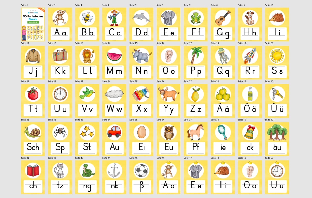 Hier findet ihr insgesamt 50 Buchstabenplakate in Druckschrift.