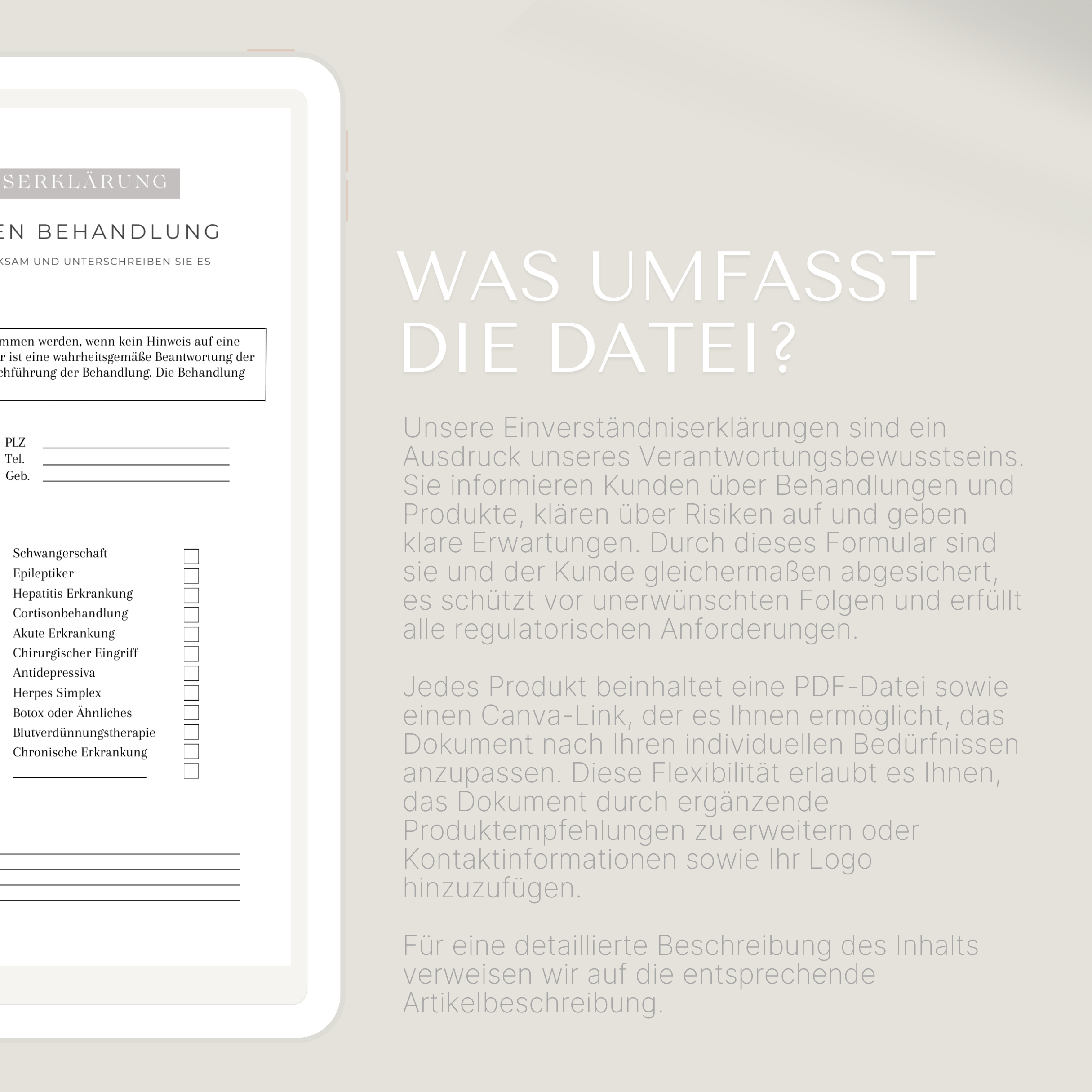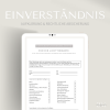 – Einverständniserklärung: Die Einverständniserklärung bestätigt, dass alle wichtigen Informationen zur Behandlung, Risiken und Nachsorge verstanden wurden und die Zustimmung erteilt wird.