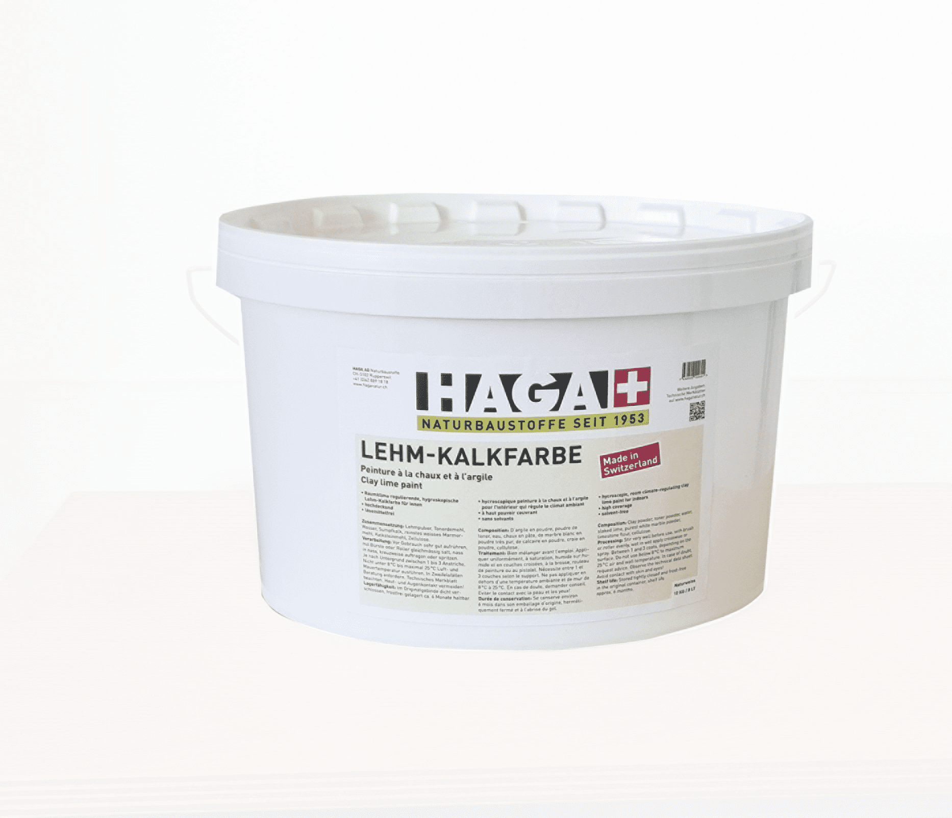 HAGA Lehm-Kalkfarbe kann Gerüche absorbieren und ergibt eine schöne, matte, natürliche Wandoberfläche. Die Lehm-Kalkfarbe ist gebrauchsfertig und hat eine sehr gute Deckkraft. HAGA Lehm-Kalkfarbe verbindet die Vorteile beider Rohstoffe. Einerseits die sehr gute Wasserdampfaufnahme und die luftreinigende Wirkung des Lehms, andererseits die mechanische Belastbarkeit, Festigkeit und Alkalität des Kalkes.
