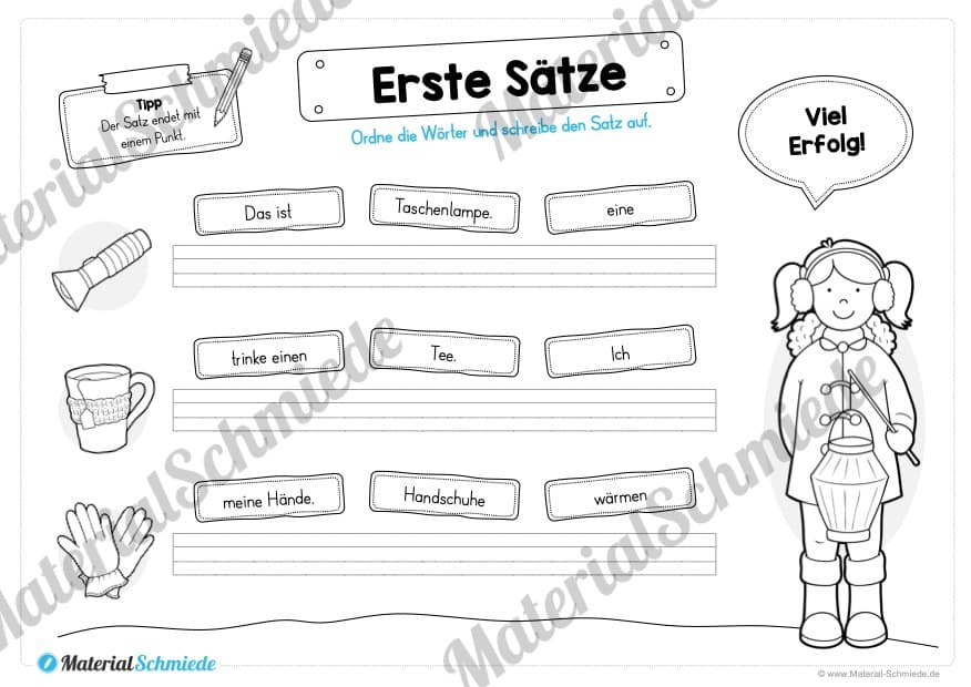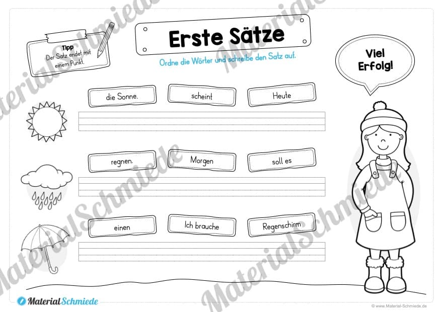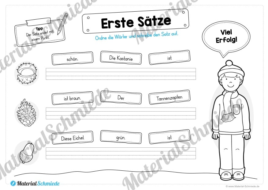 Je Arbeitsblatt sollen die Schüler 3 Sätze schreiben. Hierfür müssen wiederum drei Satzbausteine in die richtige Reihenfolge gebracht werden, damit der Satz einen Sinn ergibt.