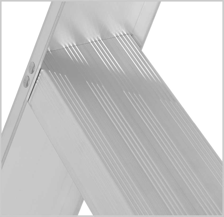 Achtfach vernietete Stufen, Vorder- und Hinterkante mit Holm bündig.