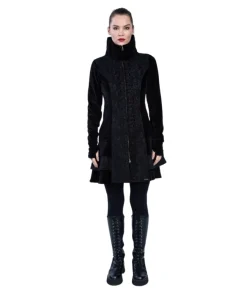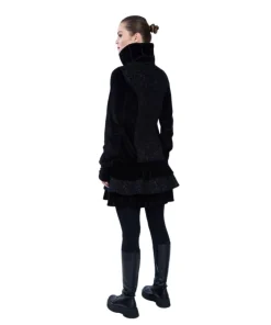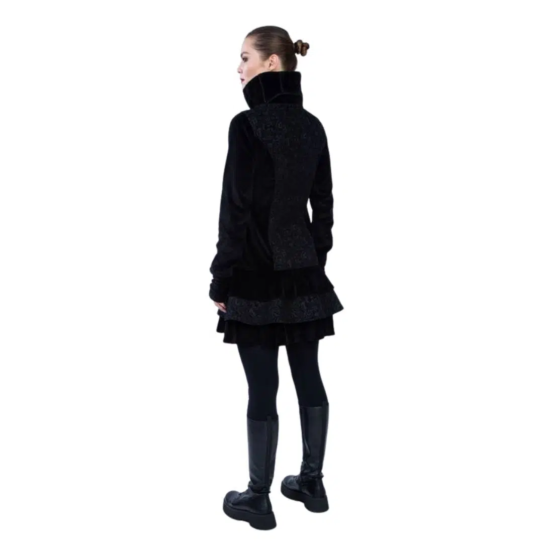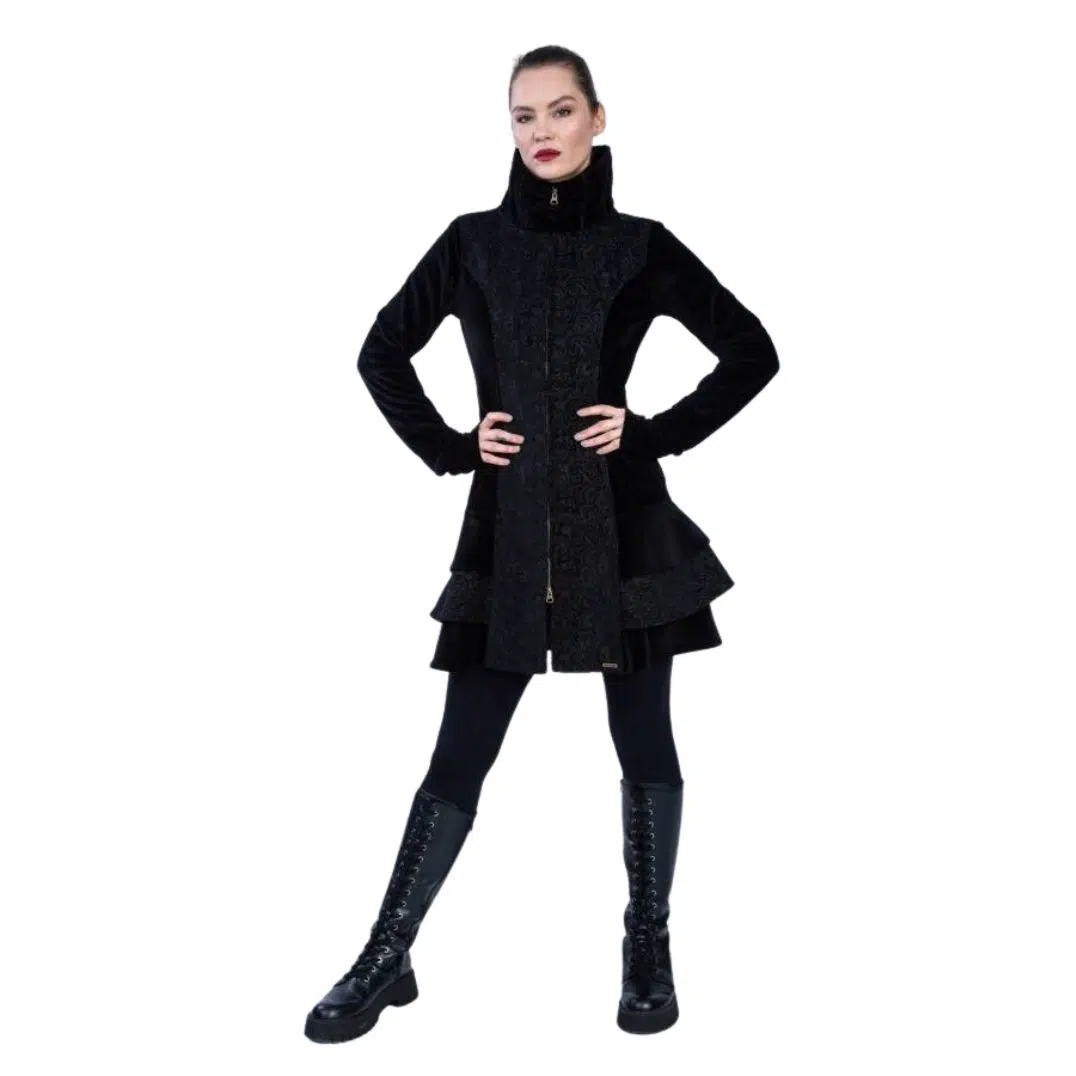 Kurzmantel „Medina“ Black ist ein sehr eleganter Mantel mit Königskragen, Reißverschluss, Stulpen mit Biesen und Volants. Du wirst dich beim Tragen fühlen wie eine wahre Königin.