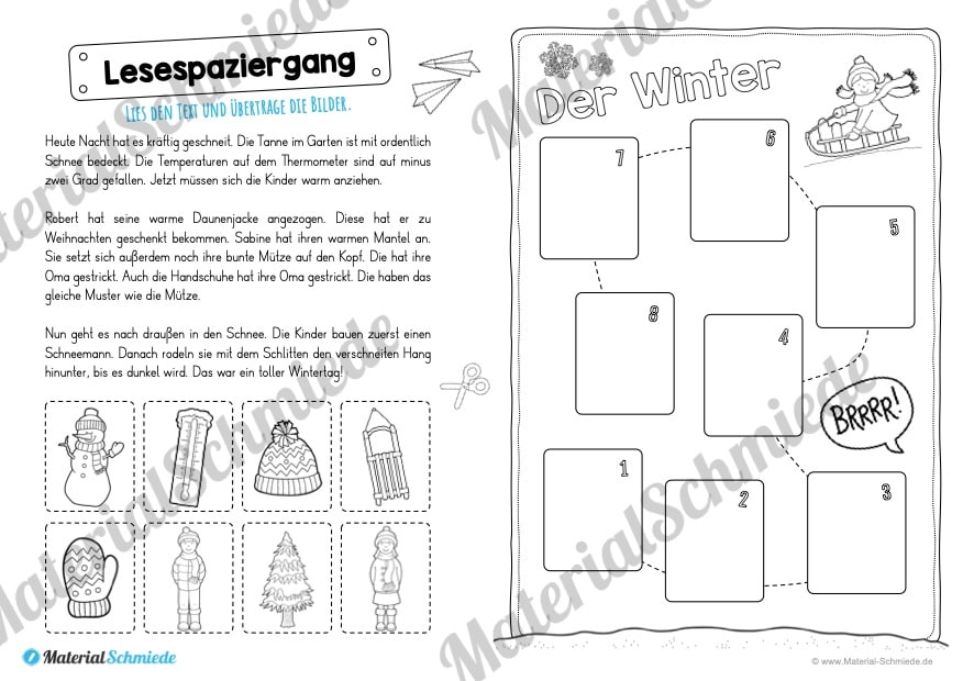Die Kinder sollen sich zunächst den Text durchlesen. Unterhalb des Textes sind acht Bilder dargestellt. Die Schüler sollen nun die Bilder entsprechend der richtigen Reihenfolge im Text in die dafür vorgesehene Schablone übertragen (ausschneiden und aufkleben).