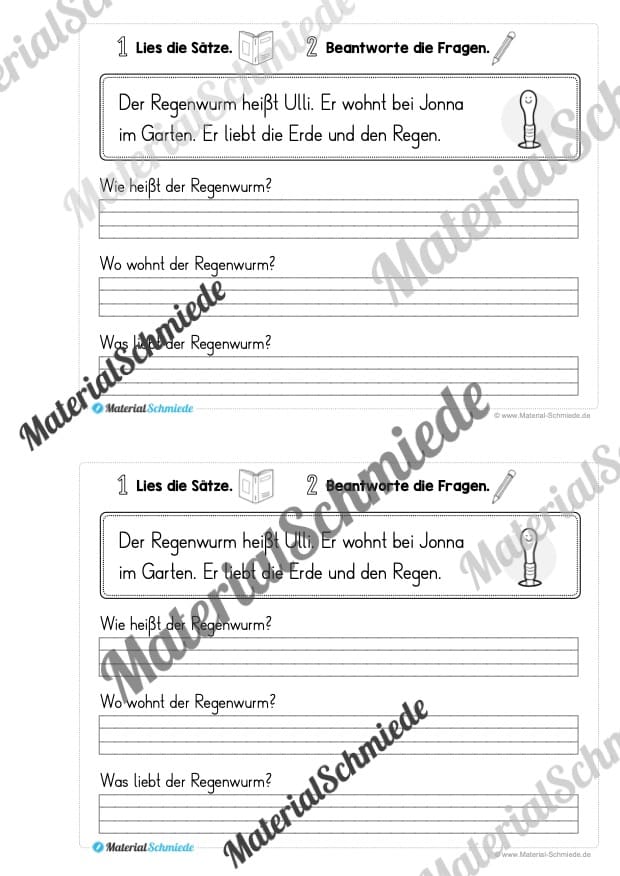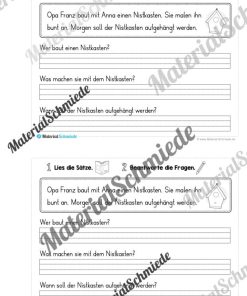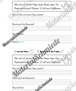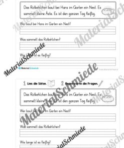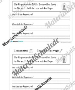 Auf jeder Seite ist ein kurzer Text mit ca. zwei bis vier Sätzen vorhanden. Jeder Satz enthält nur ein paar Wörter, sodass die Schüler in der 1. und 2. Klasse die Sätze gut lesen können. Anschließend sollen die Kinder jeweils drei Fragen zu dem Lesetext beantworten.