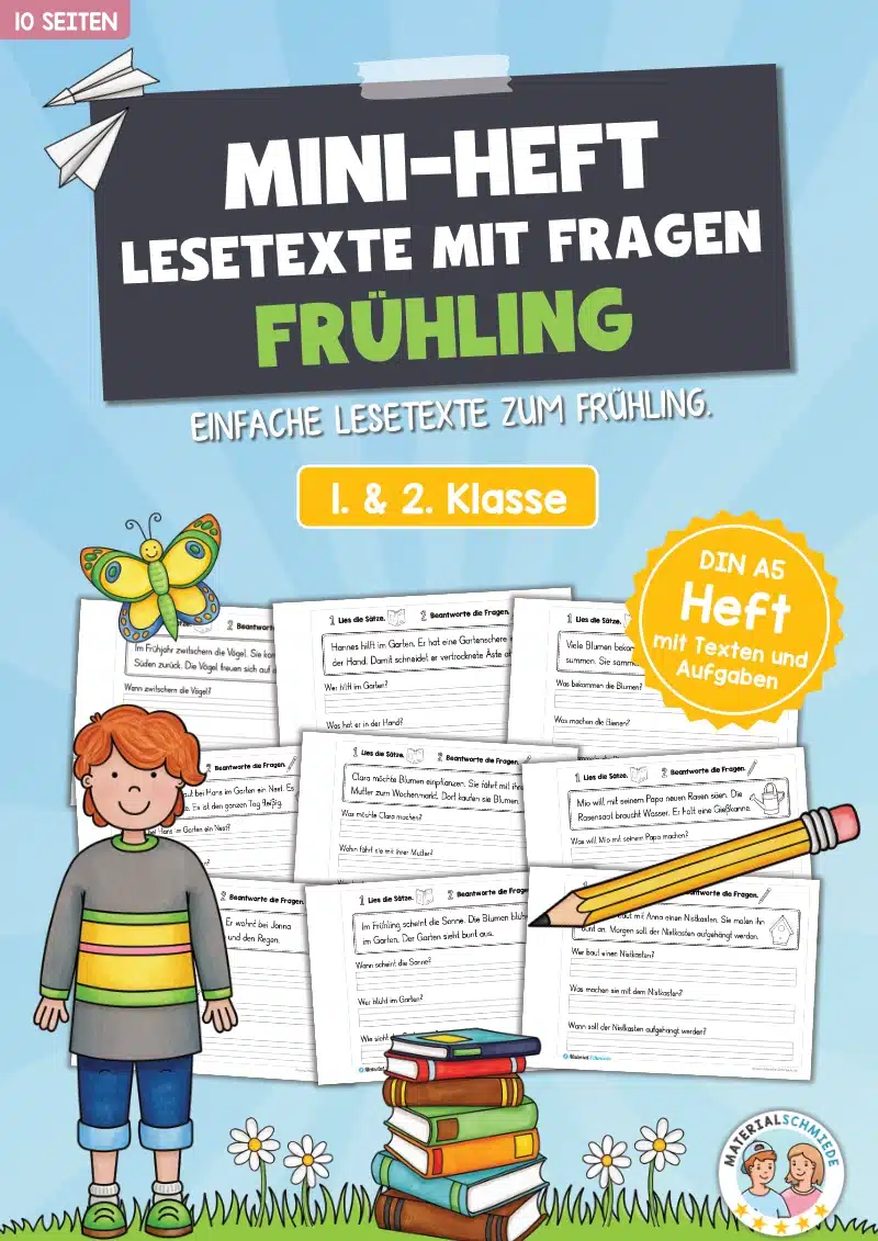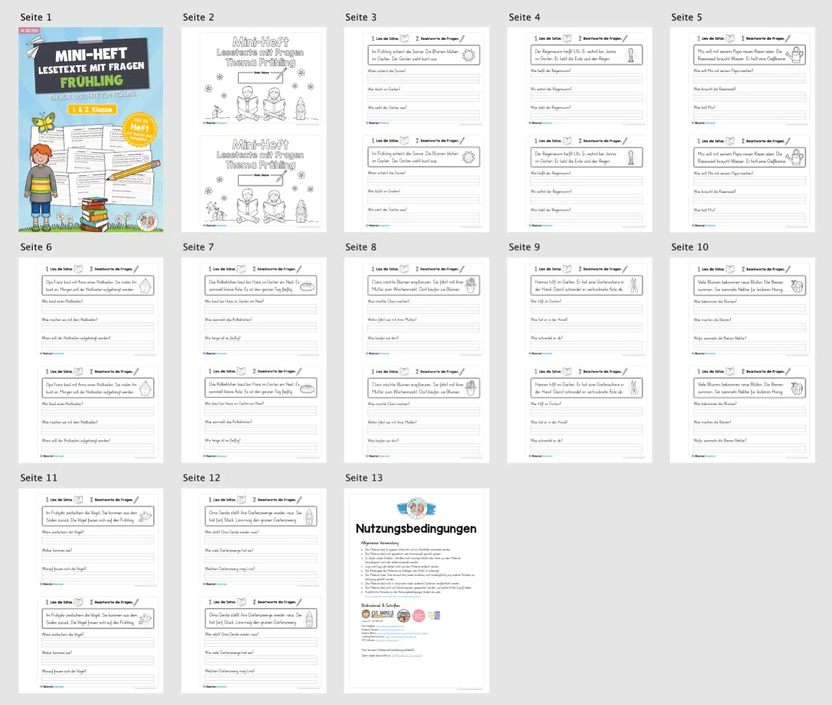 Hier findet ihr ein Mini-Heft mit Lesetexten und Fragen zum Frühling für die 1. & 2. Klasse, welches insgesamt 10 Seiten enthält.