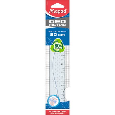 Lineal Geometric Green. Werkstoff: recycelter Kunststoff 80%, mit Tuschekante, Skalenaufdruck mit UV-beständiger Farbe, stossfest, plastikfreie, recycelbare Verpackung. Länge: 20 cm. Farbe: transparent. Ausführung des Inhalts mit Packung: in Papierhülse.
