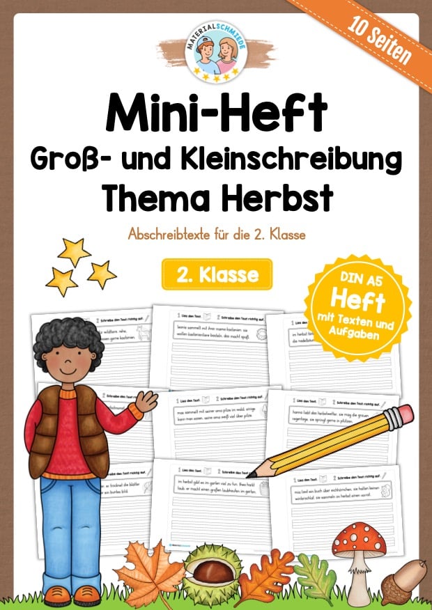 Hier findet ihr ein Mini-Heft mit 10 Abschreibtexten zur Groß- und Kleinschreibung zum Thema Herbst für die 2. Klasse im Deutschunterricht.