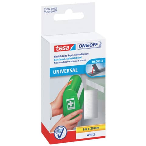 Die vielseitige Art zum Organisieren und Fixieren von leichten Gegenständen und Textilien. Für Kleidung, Heimtextilien und zum Dekorieren einsetzbar. tesa® On & Off Allzweckprodukte lassen sich 10.000 x öffnen und schließen. Hält leichte Gegenstände sicher und fest, ist individuell zuschneidbar. Klettband (Büro) tesa® zum Aufkleben. Selbstklebend. Bandgröße (L x B): 1 m x 20 mm. Farbe: weiß.