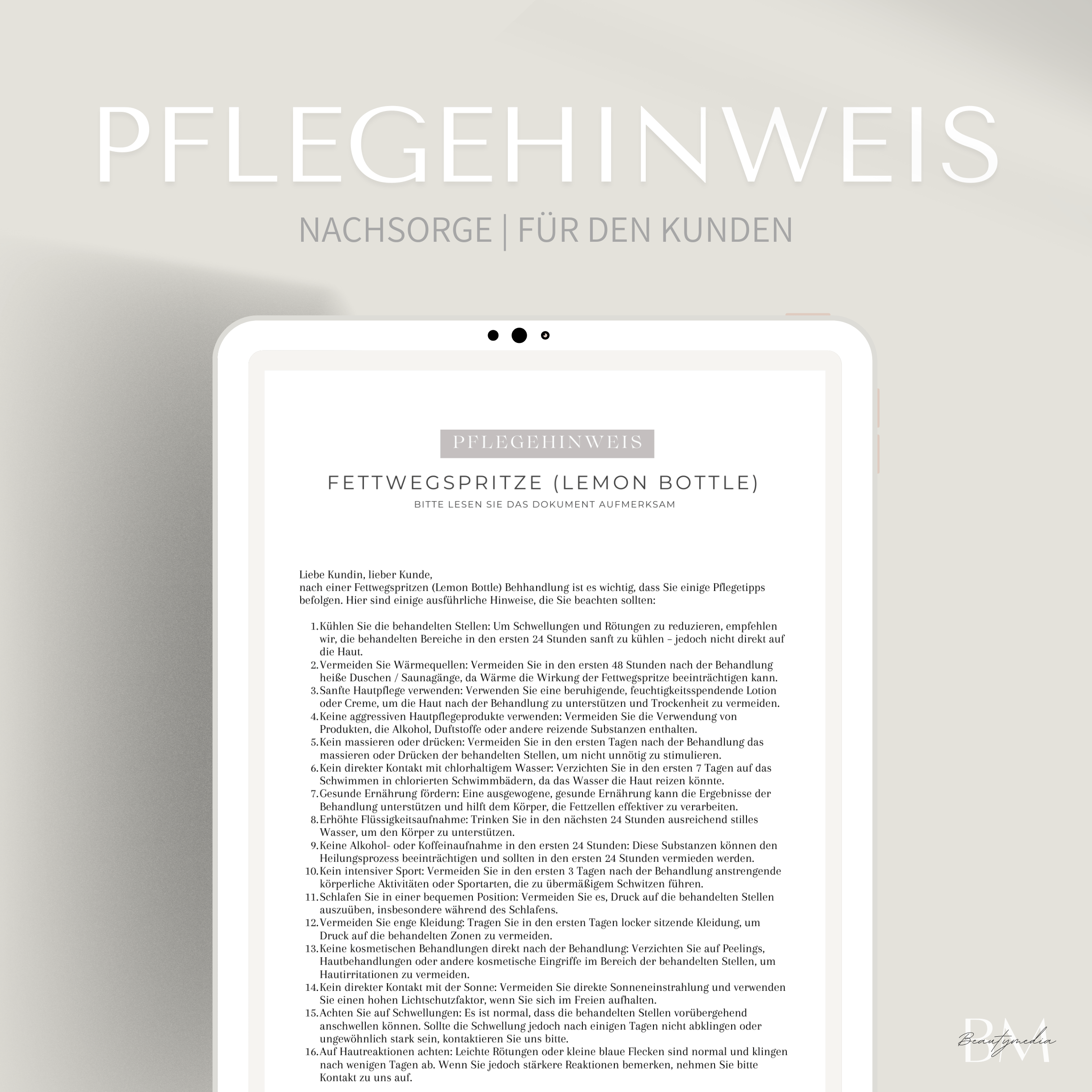 Nach einer Fettwegspritze-Anwendung ist eine achtsame Nachsorge entscheidend, um das bestmögliche Ergebnis zu erzielen und den Körper bei der Regeneration zu unterstützen. Mit unserem Pflegehinweis-Formular stellen Sie sicher, dass Ihre Kunden umfassend informiert sind und die wohltuende Wirkung der Behandlung nachhaltig fördern können.