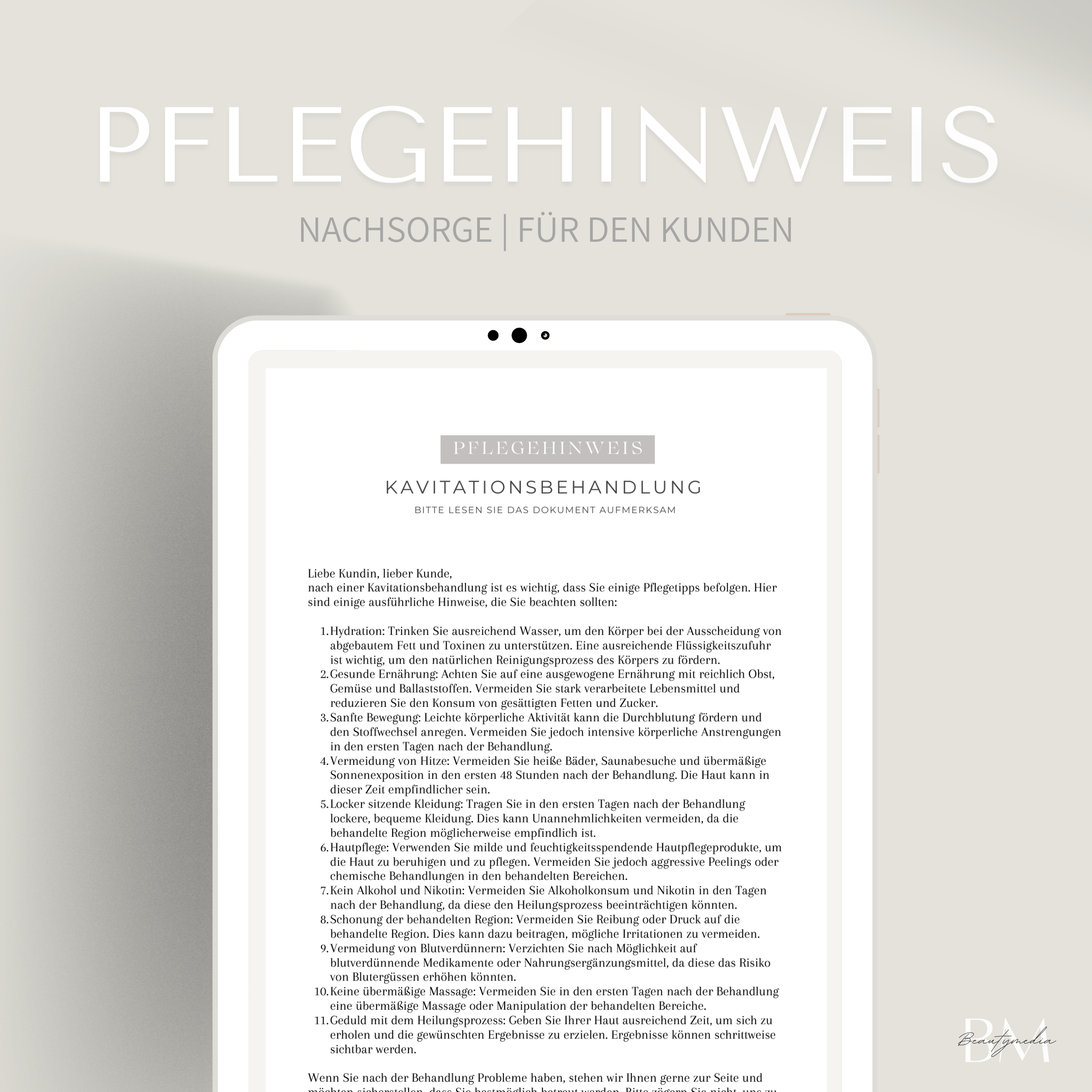 Nach einer Kavitationsbehandlung ist die richtige Nachsorge von entscheidender Bedeutung, um die Ergebnisse zu maximieren und Hautirritationen zu vermeiden. Mit einem professionellen Pflegehinweis-Formular können Sie Ihren Kunden eine klare Anleitung zur optimalen Pflege nach der Behandlung geben, damit sie die besten Resultate erzielen und sich gut betreut fühlen.
