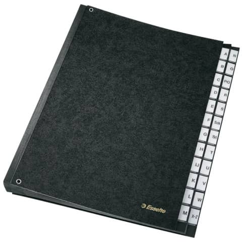 Pultordner A-Z, 24 Fächer, mit dehnbarem Rücken und überstehenden Kunststoff-Taben mit auswechselbaren Einsteckschildchen. Fächerblock mit Sichtlöchern. Material: Einband aus Graupappe (RC) mit schmutzabweisendem Polypropylen (PP) überzogen, Fächerblock aus reissfestem Karton (RC). Format: 270 x 345 mm. Farbe: schwarz.