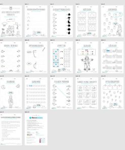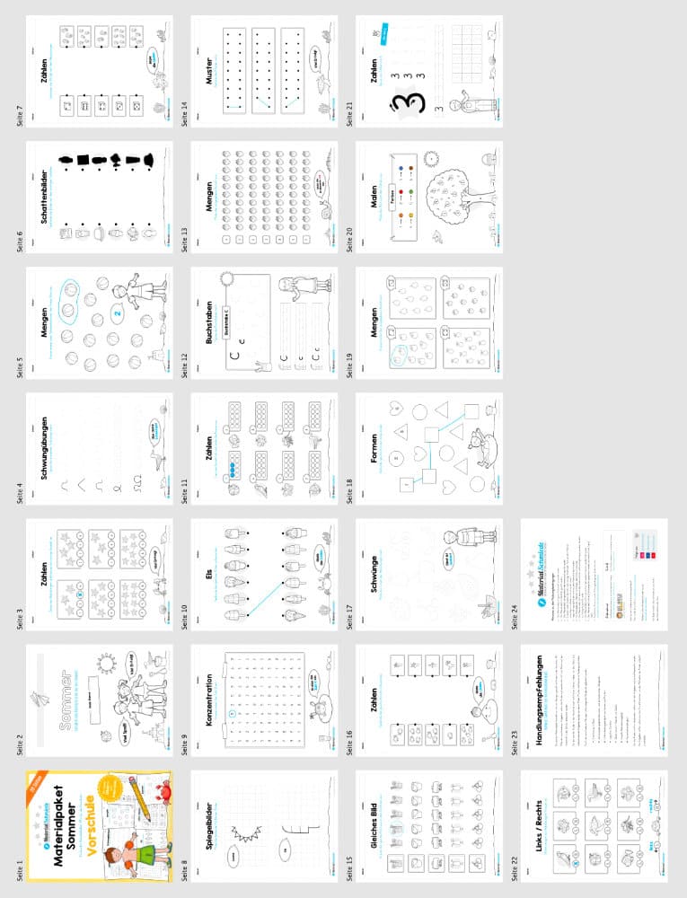 Jedes Materialpaket besitzt 20 Seiten. Darin sind verschiedene Übungen aus den Bereichen Deutsch und Mathe enthalten. Zusätzlich haben wir einige Rätsel hinzugefügt, sodass die Schüler die Hefte mit Spaß und Motivation bearbeiten und so auf spielerische Art und Weise lernen.