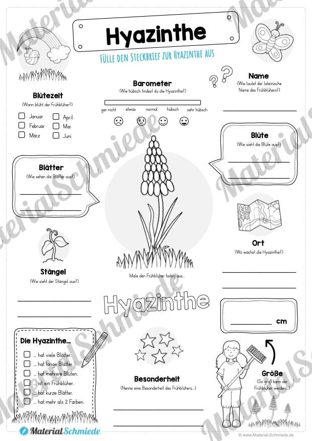 Auf diesem Arbeitsblatt finden die Schüler einen Steckbrief zur Hyazinthe. Es sollen mehrere Fragen zum Frühblüher beantwortet werden, wie beispielsweise zur Größe, dem Aussehen oder der Blütezeit.
