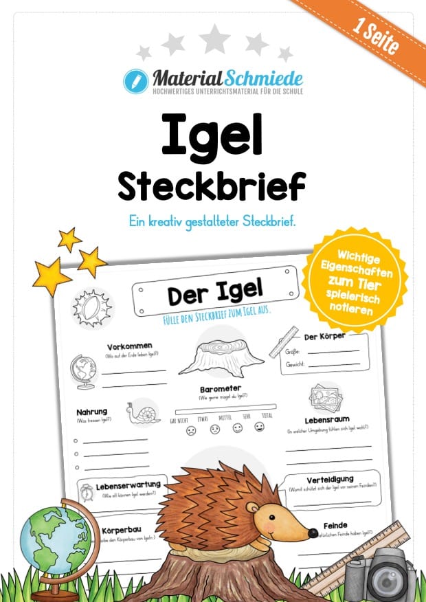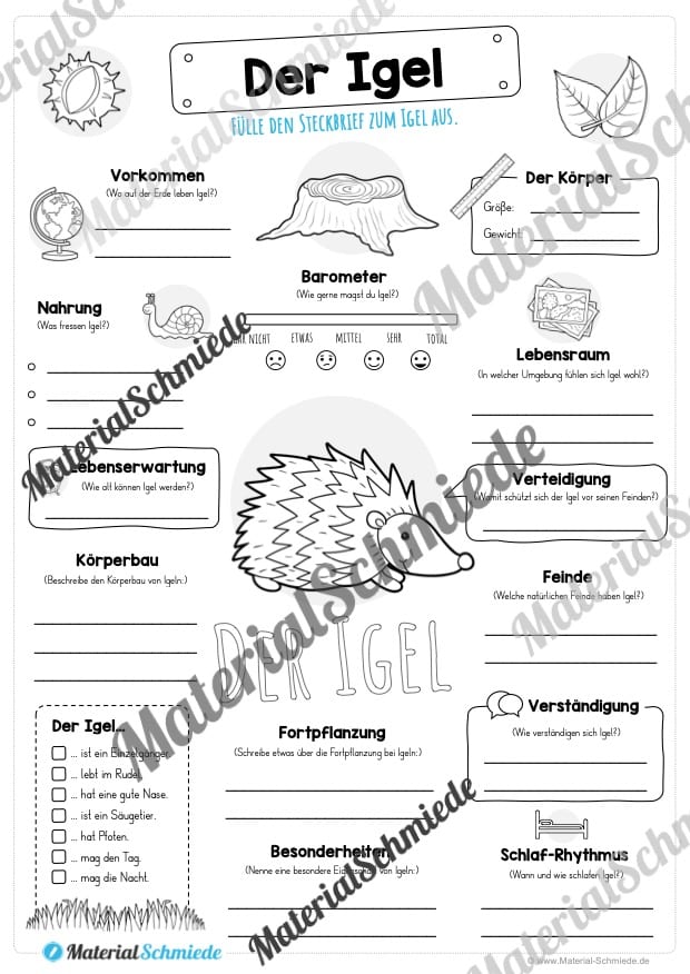 Auf diesem Arbeitsblatt finden die Schüler einen Steckbrief zum Igel. Auf dem Steckbrief sollen verschiedene Daten zum Igel notiert werden, wie zum Beispiel: