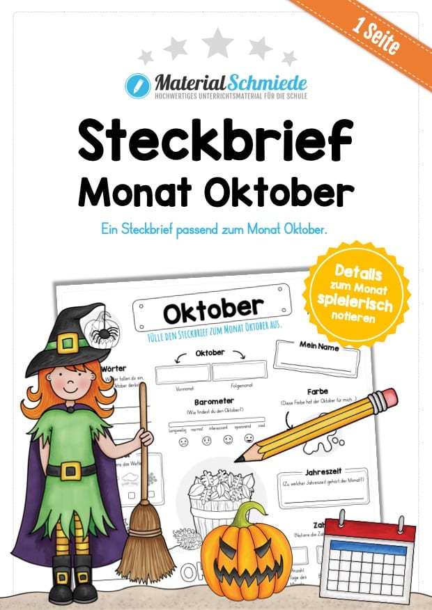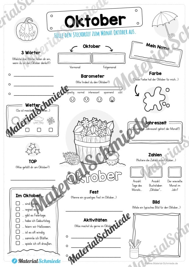 Auf diesem Steckbrief dreht sich alles um den Monat Oktober. Die Schüler sollen auf dem Arbeitsblatt verschiedene Fragen auf spielerische Art und Weise zum Oktober beantworten.