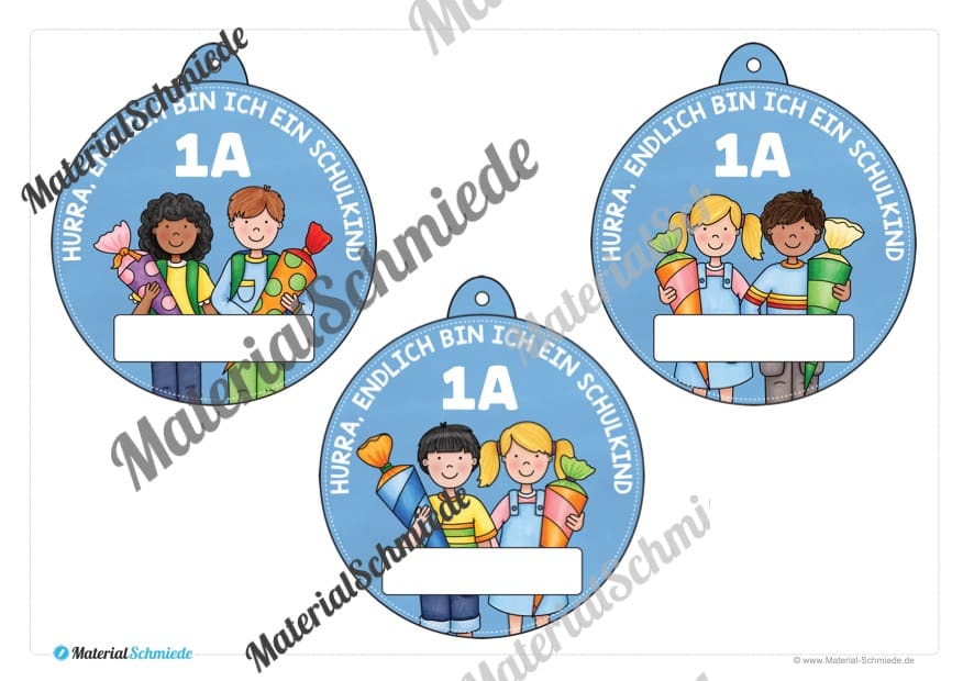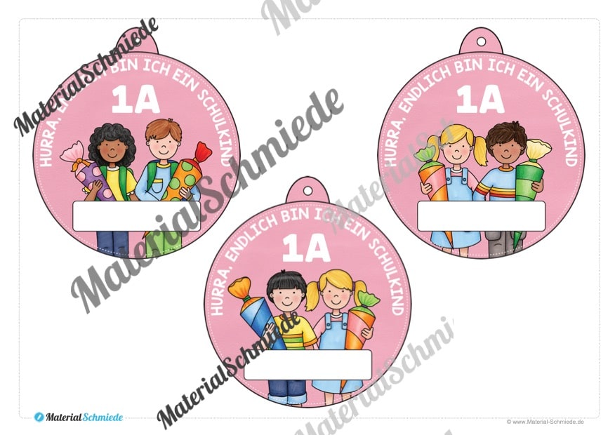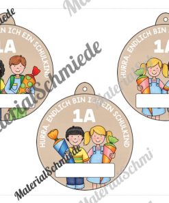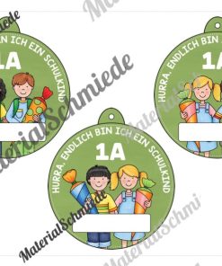 Neben dem Schriftzug „Hurra, endlich bin ich ein Schulkind“ findet ihr zusätzlich ein weißes Feld, in welches ihr den Namen des Kindes eintragen könnt. Außerdem ist die Klasse (z.B. 1A) mit auf dem Umhängeschild zu sehen. So erhalten die Schüler nicht nur ein kleines Geschenk, sondern die Umhängeschilder unterstützen zugleich bei der Einteilung und Übersicht der Klassen am ersten Schultag.