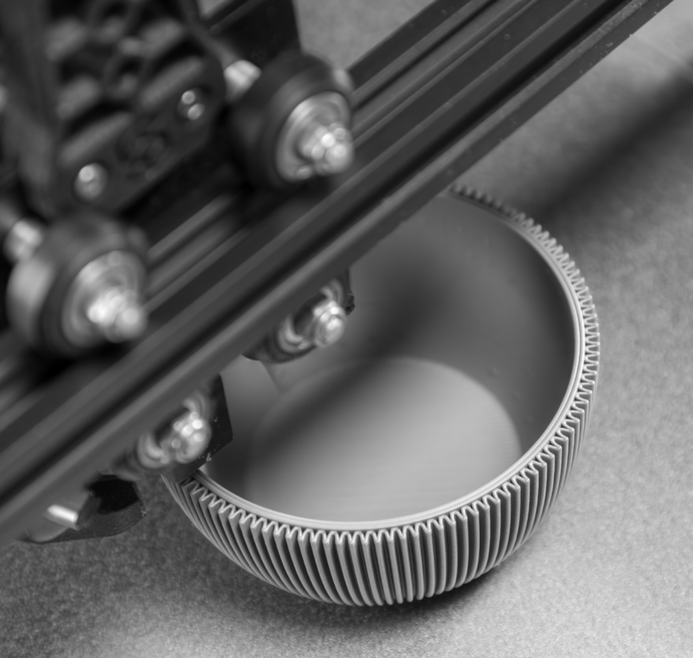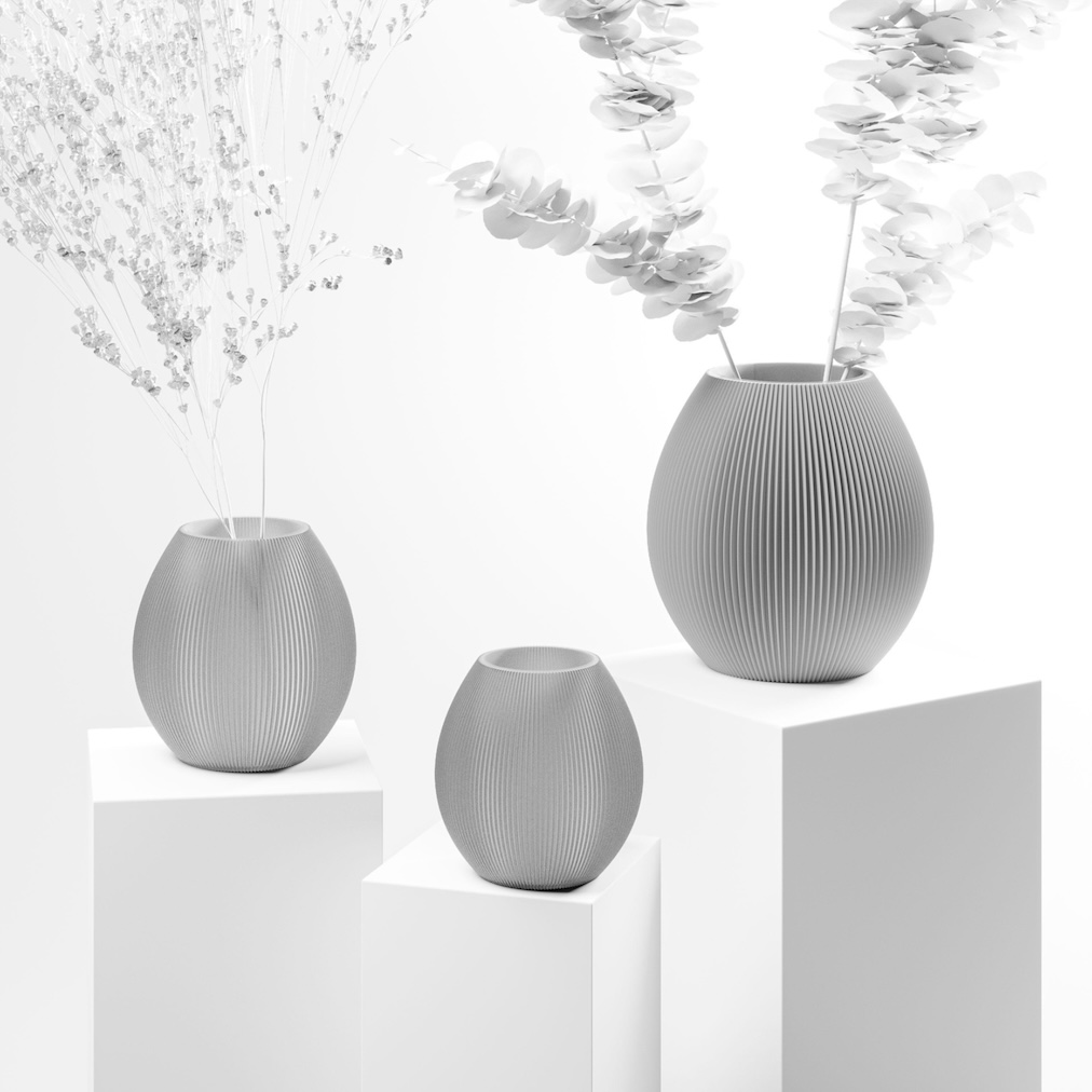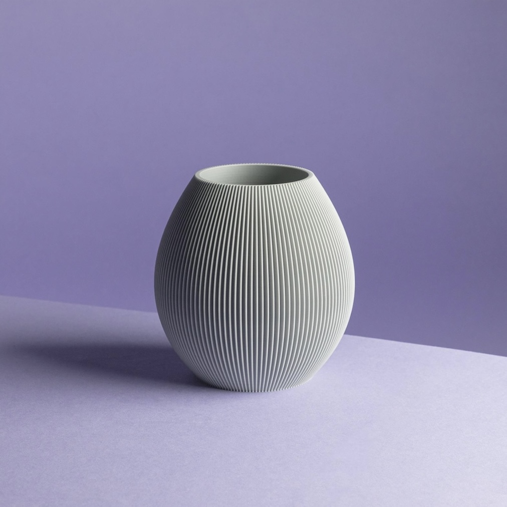 Vase: Die aus Polymilchsäure, kurz PLA, hergestellte Vase ist ein einzigartiges Objekt, das durch hunderte dünne Schichten zum Leben erweckt wird. Kleine – für das Auge kaum sichtbare – Irregularitäten machen jede Vase zu einem Einzelstück.