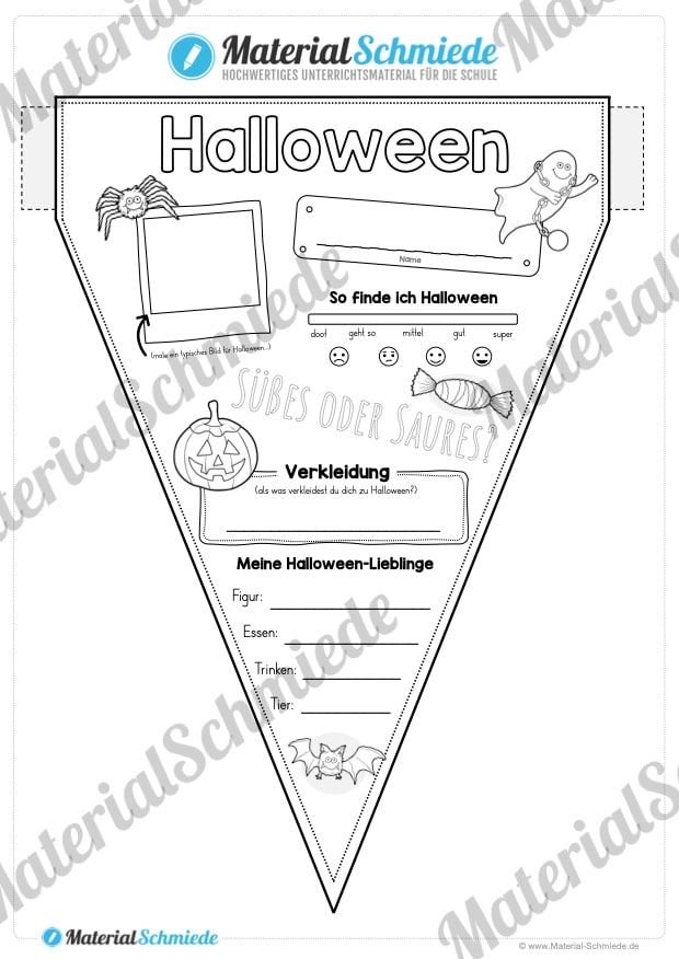 Auf diesem Arbeitsblatt findet ihr einen Wimpel zum Thema Halloween. Jeder Schüler soll den Wimpel so ausfüllen, wie er Halloween selbst wahrnimmt. Anschließend könnt ihr die einzelnen Wimpel zu einer Wimpelkette zusammenfügen und diese im Klassenraum aufhängen.
